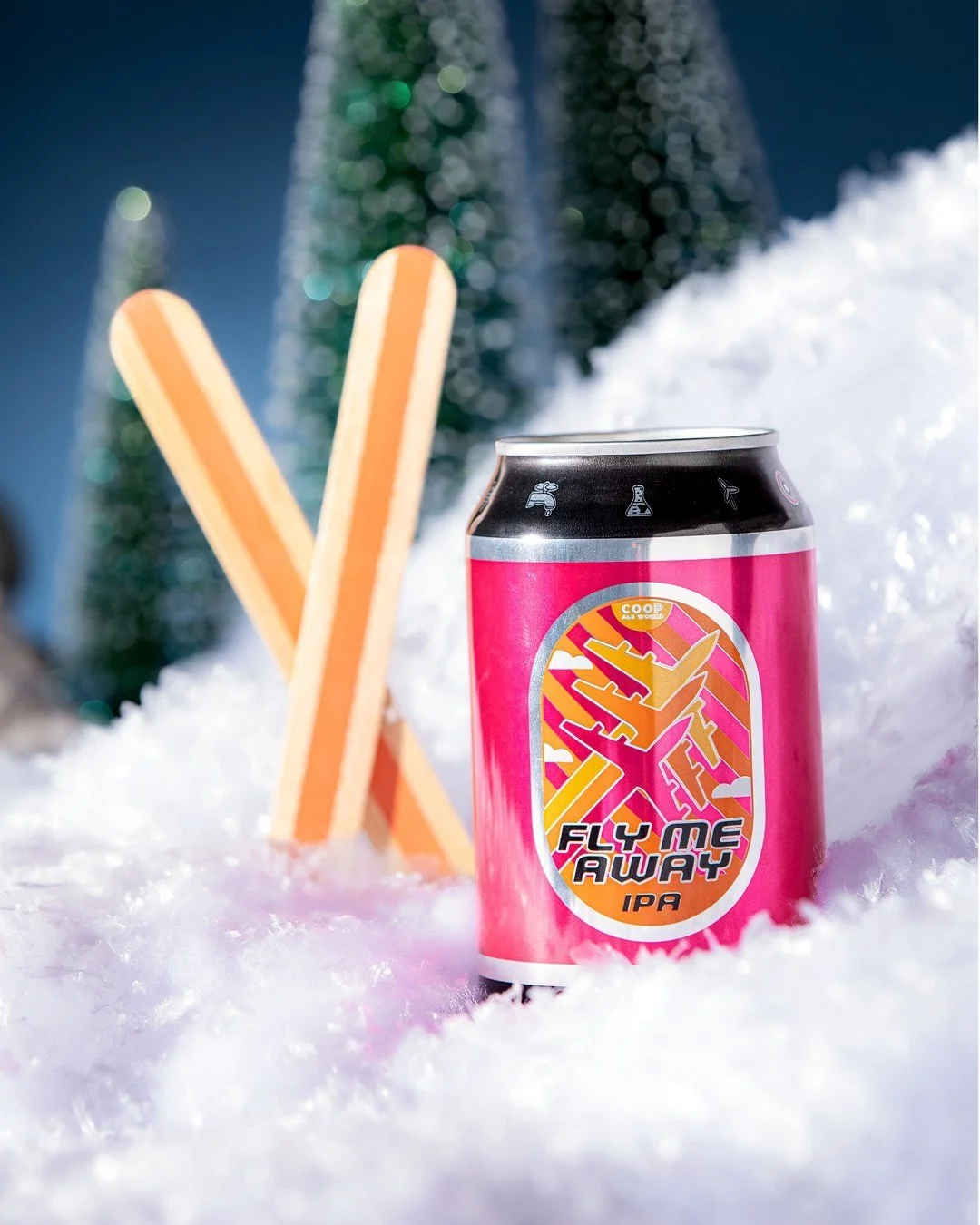 COOP Ale Works, Robot House’s long-standing client, reached out seeking a unique campaign to inform faithful customers their summer seasonal Fly Me Away IPA would be changing to a winter seasonal. With social media as one of the key deliverables for this photoshoot, it was important to create something memorable and fun. Hand-painted skis, careful placement of fake snow, and unique lighting all came together to create a dynamic scene and whimsical personification for this product.